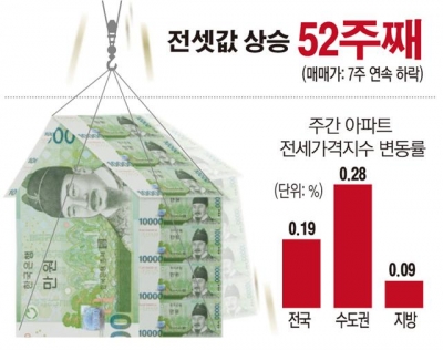 가을 이사철을 앞두고 전셋값은 52주째 오른 반면 매매가는 7주 연속 하락했다.