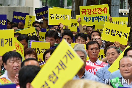 '금강산관광 및 남북경협 전면재개와 피해보상을 위한 경협기업 전체 결의대회'가 23일 세종로 서울정부청사 후문에서 열렸다. 이날 집회에 참석한 경협기업 관계자들이 경협재개를 촉구하는 손팻말을 들고 있다. 양지웅 기자 yangdoo@