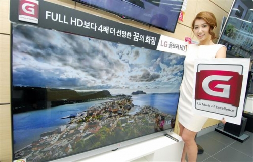 ▲G전자가 'G프로젝트' 인증을 전 제품으로 대상을 확대하며 시장 선도 기업 이미지 강화에 나섰다. 사진은 'G프로젝트'에 새로이 선정된 55인치 UHD TV. 사진제공 LG전자