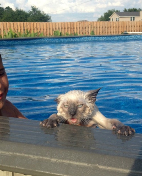 공개된 '복수심 불타는 고양이 3탄' 사진 속에는 온 몸이 흠뻑 젖은 채 수영장 난간을 두 발로 잡고 있는 고양이의 모습이 담겨 있다. 누가 물에 빠뜨리기라도 한 듯 지친 표정이 역력해 보는 이의 웃음을 자아낸다.