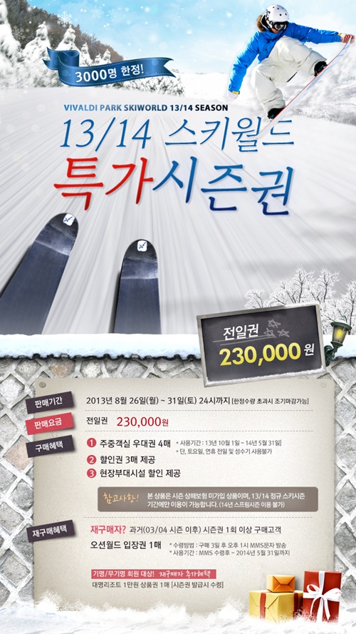 비발디파크가 올 겨울 2013/2014년도 스키월드 시즌권 특가 판매를 실시한다.