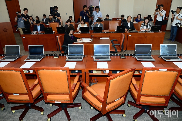 여성가족위원회 전체회의가 26일 오전 여의도 국회에서 새누리당 단독으로 열려 참석하지 않은 야당의원들의 자리가 텅 비어 있다. 노진환 기자 myfixer@