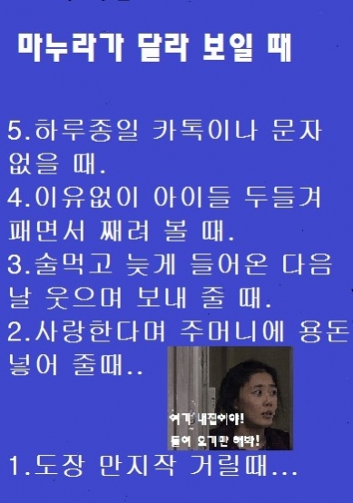 최근 온라인 커뮤니티에는 '친구가 달라 보일 때'에 이어 '마누라가 달라 보일 때'라는 제목의 게시글이 올라왔다.