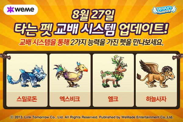 위메이드 엔터테인먼트에 따르면 '교배 시스템'은 보유 중인 '타는 펫' 두 마리의 능력을 더해, 보다 훌륭한 펫을 탄생시킬 수 있는 새로운 콘텐츠다.