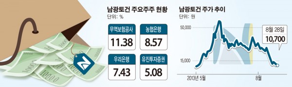 남광토건은 최근 주요 주주들이 연이어 보유주식을 장내에서 매도하면서 주가가 급락하고 있는 상황이다. 16일부터 27일까지 8거래일간 주가 하락률은 58.2%에 달한다.