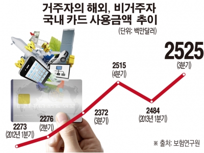 한편 외국인 등 비거주자가 국내에서 쓴 카드 사용액은 12억 달러로 직전 분기보다 7.5% 늘었다.