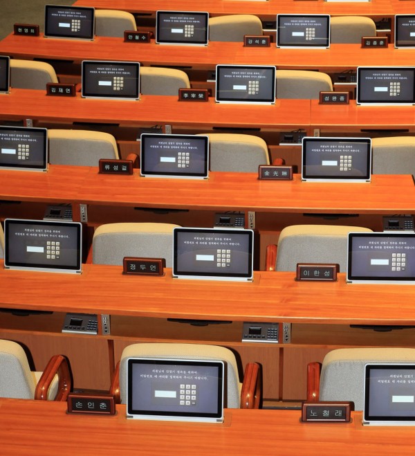 국회의원들이 본회의 표결 때 단말기에 '재석' 버튼만 누르면 별도의 본인 확인절차 없이 투표가 가능했지만 9월 정기국회부터는 자신의 단말기에 비밀번호를 입력해야 투표가 가능하다. 기존 방식에서는 일부 의원들의 '대리투표' 논란이 빚어져 문제가 일어나기도 했다. 사진은 29일 공개된 리모델링된 본회의장 내부 모습.