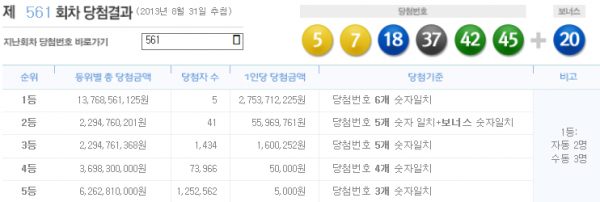 지난달 31일 실시된 로또561회 당첨번호는 ‘5, 7, 18, 37, 42, 45’이며, 2등 보너스 번호는 ‘20’이다.