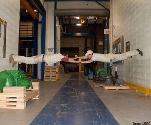 사진 속 남자들은 발로 벽을 밟고, 두 손을 맞잡은 채 버티고 있어 마치 벽에 서 있는 듯이 보인다.