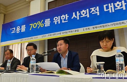 '고용률 70%를 위한 사회적 대화' 토론회가 3일 서울 태평로 프레스센터에서 열렸다. 이날 토론회에 참석한 패널들이 주제발표를 하고 있다. 양지웅 기자 yangdoo@