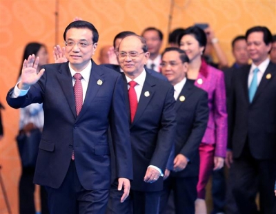 리커창(맨 앞) 중국 총리가 3일(현지시간) 중국 광시장족자치구 난닝에서 열린 중-동남아국가연합(ASEAN)박람회에서 아세안 10국 지도자과 손을 흔들며 개막식에 등장하고 있다. 중국과 ASEAN 10국의 경제 교류의 장인 이 박람회는 올해 10회째를 맞는다. 리 총리는 개막연설에서 “아세안과 중국의 협력은 선린 합작 체제의 전형이 됐다”며 “이제까지 황금 같은 10년을 만들었고 앞으로 금강석 같은 10년을 만들 능력을 갖췄다”고 앞으로 협력을 강화할 것을 시사했다. 난닝/신화연합뉴스