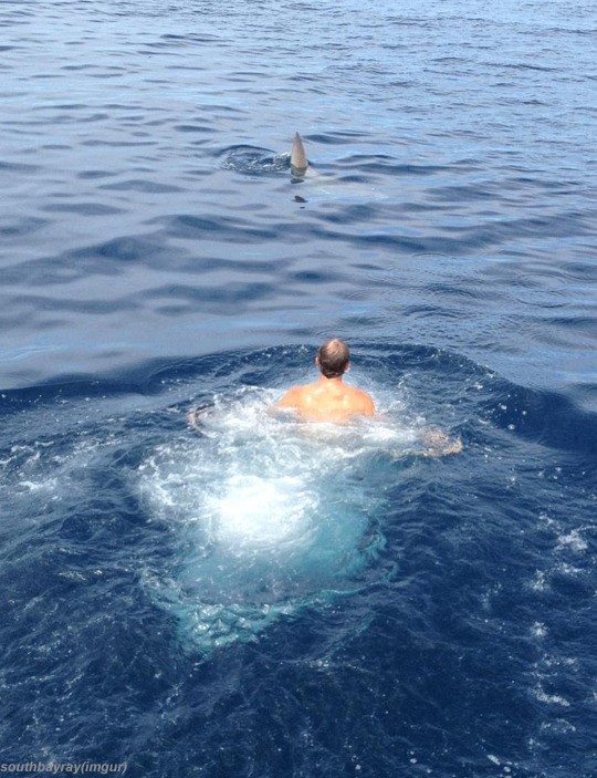 한 미국인이 공개했다는 이 사진에는 바다 한 가운데서 수영을 하고 있는 남자와 그 남자를 향해 헤엄쳐 오고 있는 상어의 모습이 담겨있다.
