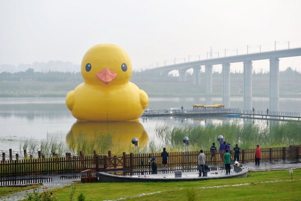 6일 중국 베이징의 웬보웬 호수에 러버덕(대형 고무오리)이 등장했다. 이 중국인들의 사랑을 받는 러버덕은 네덜란드 예술가 플로렌테인 호프만의 작품으로 지난 6월 홍콩에 전시된 후 중국 여러 도시에서 짝퉁 러버덕이 등장해 논란이 됐었다.
