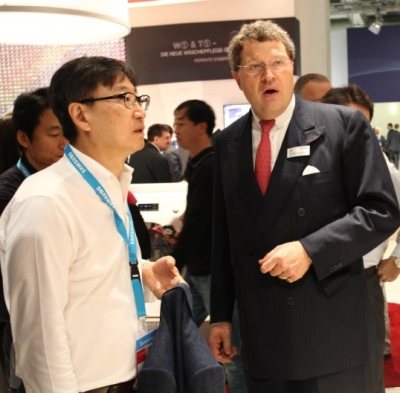 윤 사장은 이날 오전 10시45분부터 20분 가량 밀레 전시장에 들렀다. 진칸 밀레 회장이 직접 윤부 사장에게 밀레가 새롭게 선보인 'W1' 시리즈 허니컴 드럼세탁기와 'T1' 시리즈 히트펌프 의류건조기, 식기세척기, 냉장고 등 제품을 직접 설명하며 전시장을 함께 둘러봤다.