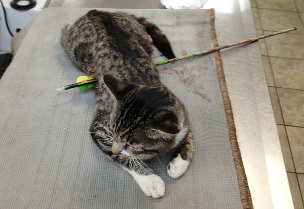지난달 22일 68㎝ 길이의 양궁용 화살로 복부를 관통당한 고양이가 미국 뉴욕주 워터빌에 있는 수의사 제임스 길크리스트의 동물병원에서 수술 받기 전 누워 있는 모습. 길크리스트는 이 고양이가 2차례 수술을 받은 후 회복 중이라고 밝혔다. 현지 경찰은 이 고양이에게 화살을 쏜 범인을 찾고 있다.