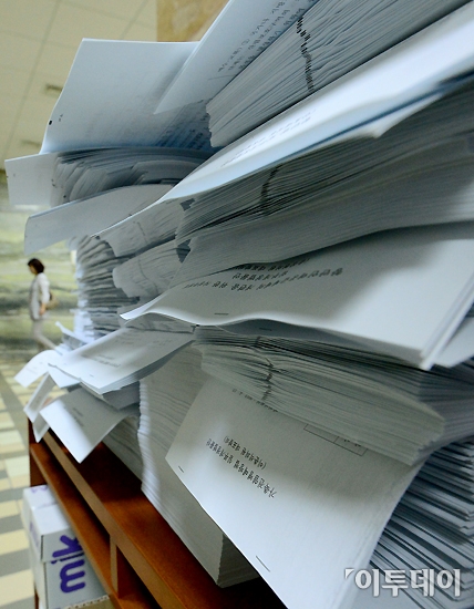 개점휴업 상태를 이어 온 9월 정기국회가 부분 정상화될 예정이지만 10일 오전 서울 여의도 국회의사당 본청에는 국회 상임위 통과를 기다리는 각종 법안들이 수북이 쌓여있다. 노진환 기자 myfixer@