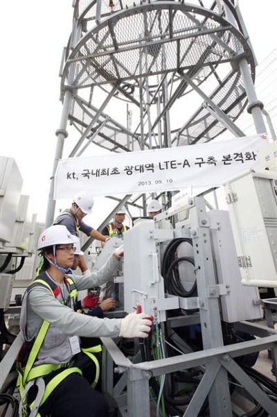 KT는 네트워크부문 기술진들이 ‘LTE-A’기지국을 업그레이드 한 후 기지국 장비 테스트를 진행하는 등 광대역 LTE-A 서비스를 위한 장비 구축을 본격적으로 시작했다고 10일 밝혔다.