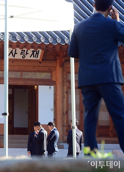 박근혜 대통령과 여야 대표의 ‘16일 국회 3자회담’이 16일 오후 여의도 국회 사랑재에서 열릴 예정이다. 이날 오전 회담을 앞둔 사랑재에서 경호실 관계자들이 주변을 살펴보고 있다. 노진환 기자 myfixer@