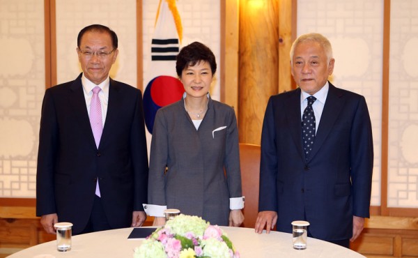 16일 박근혜 대통령과 황우여 새누리당 대표, 김한길 민주당 대표와 3자 회담에 앞서 기념촬영을 하고 있다.