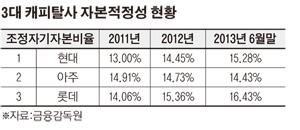 반면 경쟁업체들은 이와 달리 시간이 지날수록 건전성을 높이고 있다. 현대캐피탈의 경우 2011년 기준 13.00%로 업계에서 가장 낮은 조정자기자본비율을 보였으나 2012년 14.45%로, 이어 올해 6월 말 15.28%까지 높였다. 가장 높은 건전성을 보여주는 롯데캐피탈도 끊임없이 이 수치를 높이면서 올해 6월 말 처음으로 16%를 넘어섰다. 감독기관의 규정 비율보다 두 배 이상의 건전성을 보인 것이다.
