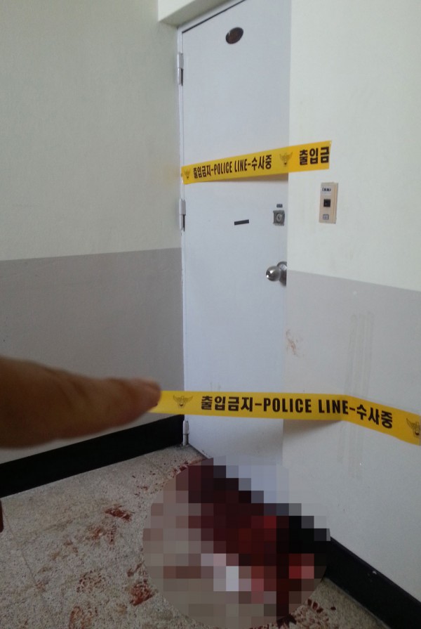 강원 태백경찰서는 태백시 한전직원숙소에서 김모(20·여)씨를 흉기로 찔러 살해한 혐의로 이모(20)씨를 붙잡아 조사하고 있다고 17일 밝혔다. 경찰은 이씨가 직장 동료인 김씨로부터 최근 결별을 통보받자 격분, 범행을 저지른 것으로 보고 정확한 범행 동기를 조사하고 있다. 사건이 일어난 직원숙소 출입문 앞에 검붉은 피가 흥건하게 고여 있어 범행 당시의 처참한 광경을 그대로 보여주고 있다.