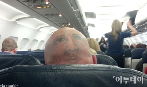 사진 속 비행기 앞좌석 사람은 머리에 얼굴 그림을 그렸다.