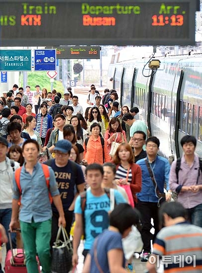 추석 연휴 마지막 날인 22일 오전 서울역 승강장이 귀경인파로 붐비고 있다. 방인권 기자 bink7119@
