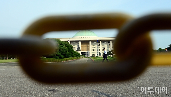 여야의 힘겨루기는 언제 끝날까? 정기국회가 3주째 공전을 이어가고 있는 23일 오전 여의도 국회의사당 앞 사슬 사이로 보이는 국회의 모습이 현 상황을 나타내고 있는 듯하다. 노진환 기자 myfixer@
