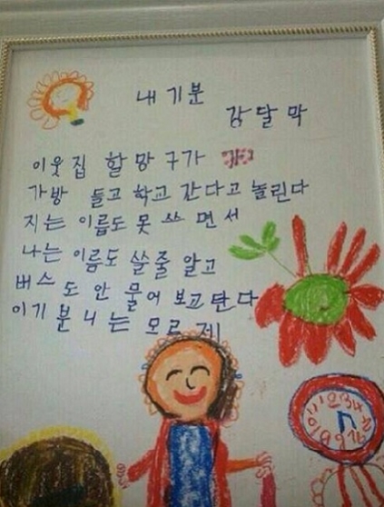 게시글 속 사진에는 늦깍이 초등학생 강달막 할머니가 지은 짤막한 시화가 담겨 있다. '내 기분'이라는 이 시는 "이웃집 할망구가 가방 들고 학교 간다고 놀린다. 지는 이름도 못쓰면서. 나는 이름도 쓸 줄 알고 버스도 안물어보고 탄다. 이 기분, 니는 모르제."가 전부다.