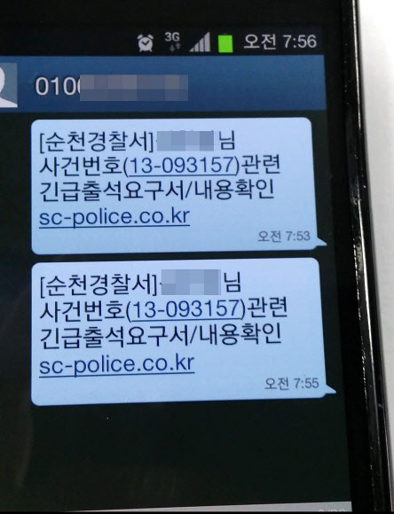 메시지에는 "[순천경찰서]OOO님 사건번호(13-093157) 관련 긴급출석요구서/내용확인"이라는 문구와 함께 정체불명의 인터넷 주소(sc-police.co.kr)가 적혀 있었다.