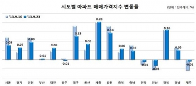 시도별로는 △세종(0.20%) △경북(0.16%) △강원(0.14%) △대구(0.13%) △인천(0.09%) △울산(0.08%) △서울(0.08%) △경기(0.07%) 등이 상승한 것으로 집계됐다.