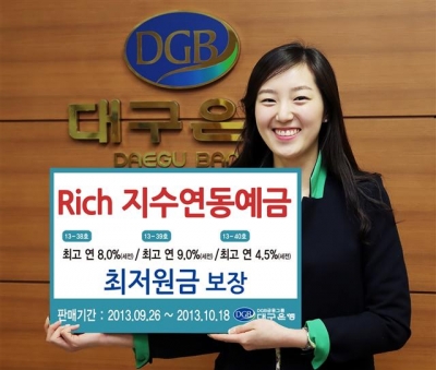대구은행은 다음달 18일까지 코스피(KOSPI) 200지수를 기초자산으로 하는 ‘Rich 지수연동예금’ 13-38호, 13-39호, 13-40호 3종과 4% 정기예금을 선착순 판매한다고 26일 밝혔다.