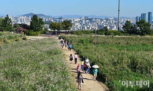 완연한 가을 날씨를 보인 26일 오후 서울 마포구 하늘공원을 찾은 시민들이 갈대숲을 거닐며 가을정취를 만끽하고 있다. 방인권 기자 bink7119@