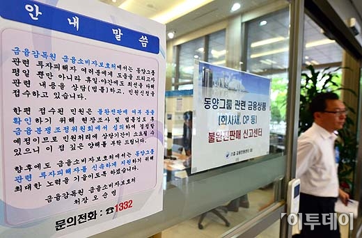 금융감독원 신고센터에 접수된 동양 그룹의 기업어음과 회사채 관련 민원이 7천 건을 넘어서는 등 동양사태 관련 분쟁 조정신청이 줄을 잇고 있다. 7일 오전 서울 영등포구 여의도동 금융감독위원에 마련된 '동양그룹 관련 금융상품(회사채, CP 등) 불완전판매 신고센터'에서 한 투자자가 상담을 받고 나오고 있다. 방인권 기자 bink7119@