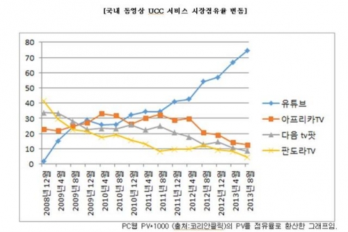 같은 기간 시장 점유율 42%로 1위를 점하던 판도라TV의 시장 점유율은 4%로 추락했고, 34%의 시장을 가졌던 2위 사업자 다음TV팟의 점유율은 8%로 급락했다. 또 아프리카TV의 점유율 역시 23%에서 13%로 반토막 났다.