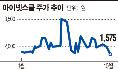 아이넷스쿨의 주가는 지난해 7월 감자를 통한 자본금 축소로 자본잠식 상태를 해소한 이후 지지부진한 흐름을 보이고 있다. 올해 5월부터 실적 개선 기대감과 함께 JYP·JYP엔터 합병소식에 주가 급등하기도 했지만 최근 1550원까지 떨어지는 등 재차 부진한 흐름을 이어가고 있다.