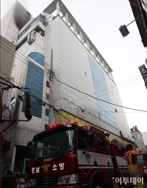 10일 오전 10시40분쯤 경남 거제시 고현동의 한 영화관 10층 건물 중 8층에서 불이 나 소방당국이 화재를 진압하고 있다.