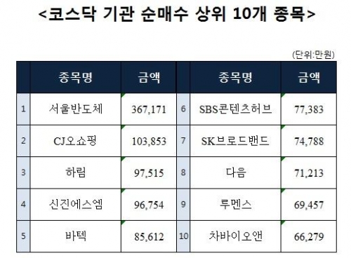 [코스닥 기관 순매수 상위 10개 종목]
