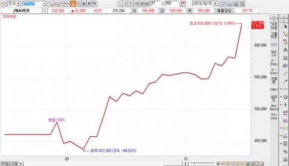 외국인이 적극적인 ‘사자’가 주가를 견인하고 있다. 외국인은 지난 8월 29일 분할상장 이후 단 사흘을 제외하고 내내 tns매수를 이어오며 9158억3900만원어치의 주식을 사들였다. 이에 주가도 급등하고 있다. 분할 상장 당일 46만원으로 시초가를 형성한 네이버 주가는 한달여만에 63만원대까지 치솟으며 37.39%나 급등했다.