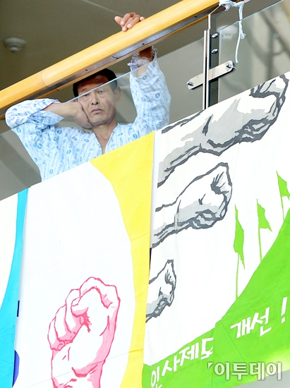 서울대학교병원 노동조합이 서울대병원과 임금인상과 처우개선 등을 놓고 이견을 보여 23일 오전 5시부터 총파업에 돌입 했다. 이날 오전 서울 종로구 연건동 서울대학교병원 본관에서 환자가 총파업 출정식을 지켜보고 있다. 노시훈 기자 nsh@