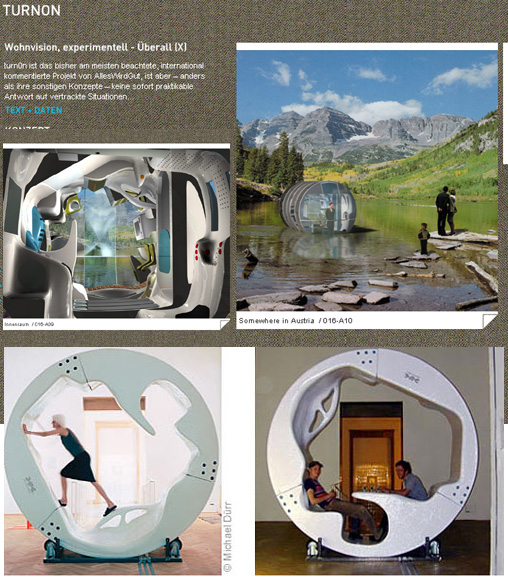 사진 속에는 쳇바퀴 모양을 한 집의 모습이 담겨져 있다. 이 쳇바퀴 주택은 오스트리아 건축 회사인 AWG(AllesWirdGut)의 젊은 건축가들이 설계한 '턴 온(Turn On)'이라는 이름의 미래 주택이다.