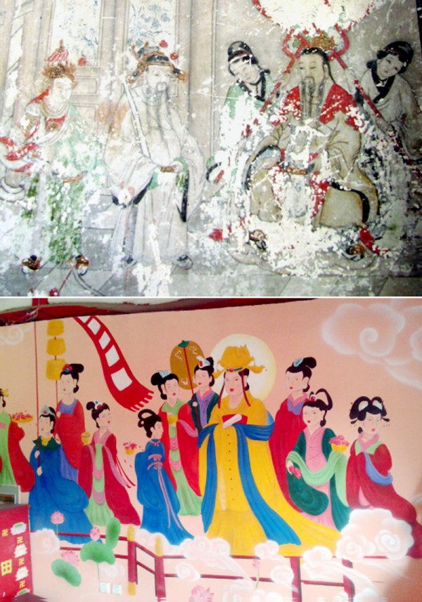 중국의 한 사찰이 수백 년 된 벽화를 엉망으로 복원해 파문이 일고 있다. 랴오닝성 펑황산의 윈제사에 있는 이 벽화는 원래 청나라 초기 작품(사진 위)으로 역사적 가치를 지닌 것이었으나 사찰이 복원작업에 나서면서 조악한 만화 같은 그림(아래)으로 바뀌었다. 이 사건은 우자오펑(五角楓)이란 닉네임의 블로거가 블로그에 게재하며 알려졌으며, 여러 해외 매체를 통해 보도돼 네티즌들의 조롱을 받고 있다.