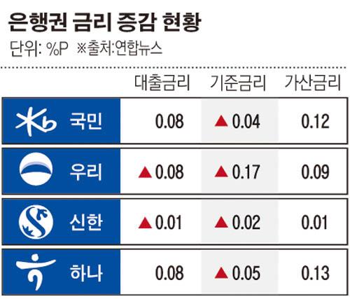 하나은행 역시 기준금리 하락으로 낮아진 대출금리를 가산금리 인상으로 상쇄했다. 하나은행의 주담대 기준금리는 2.71%에서 2.66%로 0.04%포인트 떨어졌지만 가산금리를 1.07%에서 1.20%로 인상, 대출금리를 3.78%에서 3.86%로 올렸다.