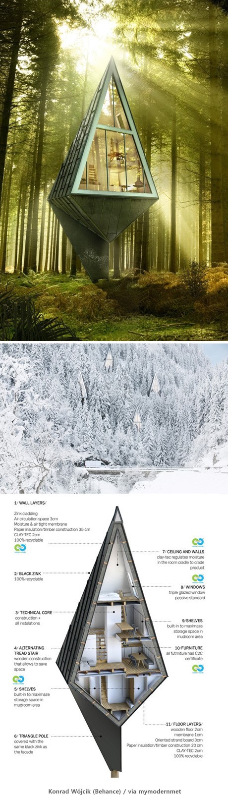 디자이너는 숲의 아름다움이나 자연의 조화를 해치지 않으면서 숲에 거주하는 방법이 없을까 고민했다고 한다.