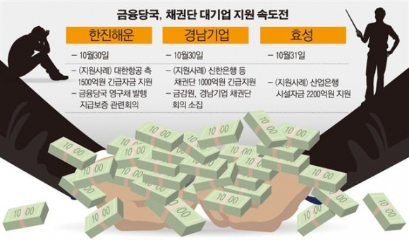 웅진·STX·동양사태를 겪은 금융당국과 금융권이 유동성에 직면한 대기업 지원에 발빠르게 움직이고 있다. 최근 일주일 사이 워크아웃(기업개선작업)을 신청한 경남기업에 1000억원의 긴급자금 지원을 결정한 데 이어 효성에 대규모 시설자금 2200억원 지원을 전격 확정했다. 한진해운과 관련해서도 근본적 자금 부족 해결책으로 신종자본증권(영구채) 발행을 위해 채권단에 지급 보증을 독려하고 있다.
