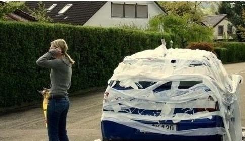 사진 속 불법주차 차량은 차 전체가 붕대와 테이프로 감겨진 모습이다. 불법주차에 화가난 누군가가 차 전체에 테이프를 감아 보복을 한 것.