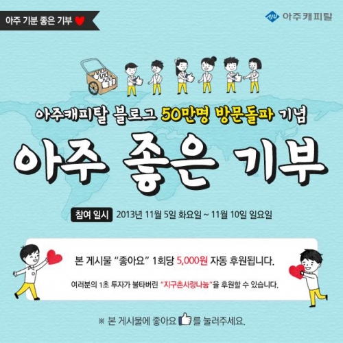 블로그 방문객 50만 명 돌파를 기념해 페이스북에서 ‘좋아요’를 누르면 아주캐피탈이 1명당 5000원씩 기부금을 적립하는 기부 이벤트를 펼치는 것이다. 이벤트를 통해 모인 기부금은 ‘좋아요’를 누른 고객들 이름을 담아 아주캐피탈 봉사처인 지구촌 사랑나눔에 전액 기부될 예정이다.