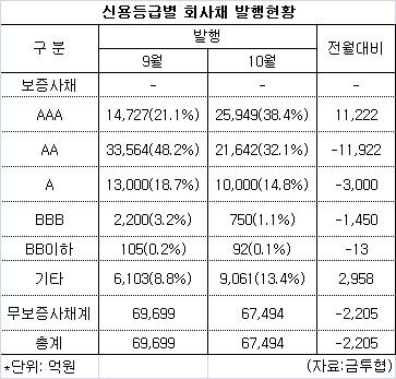 5일 한국금융투자협회가 발표한‘10월 채권 장외시장 동향’에 따르면 지난달 BBB급 이하 회사채(자산유동화증권 제외) 발행 비중은 1.25%를 기록하며 전월(3.31%)대비 2.06%포인트 감소했다. 반면 AAA급 회사채 발행은 전월대비 1조1222억원 늘어난 2조5949억원으로 집계됐다.