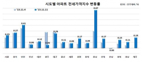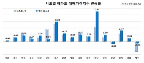 시도별로는 충남(0.67%), 인천(0.41%), 경기(0.27%), 대구(0.26%), 서울(0.23%), 제주(0.19%), 강원(0.17%), 전북(0.17%), 경북(0.15%), 대전(0.12%), 울산(0.11%) 등의 순으로 상승했다.