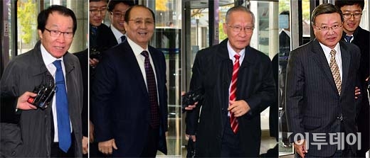 신한금융지주의 차기 회장 후보가 다음달 12일 결정될 예정인 가운데 14일 오전 신한금융지주 회장후보추천위원회의 (사진 왼쪽부터) 김기영, 고부인, 권태은, 남궁훈 사외이사가 회장 선임 작업에 임하기 위해 서울 남대문 신한금융지주 본사로 들어가고 있다. 방인권 기자 bink7119@